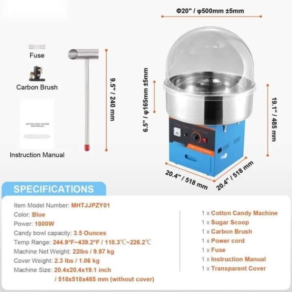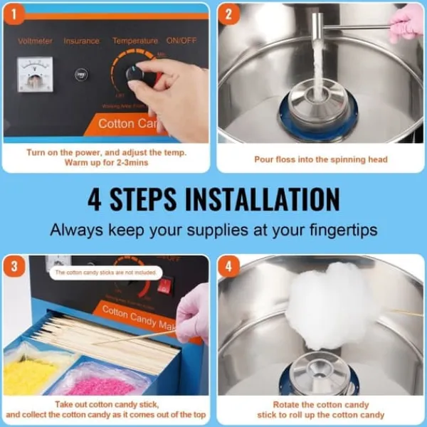 Med denna maskin kan du använda olika typer av godisar, som traditionellt socker, mjölksocker eller frukttärningar, för att skapa läckra sockervaddar. Dess kompakta storlek gör den idealisk för bänkskivan och perfekt för karnevaler, festivaler, födelsedagsfester och sportevenemang.