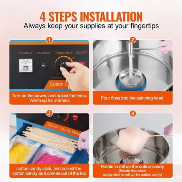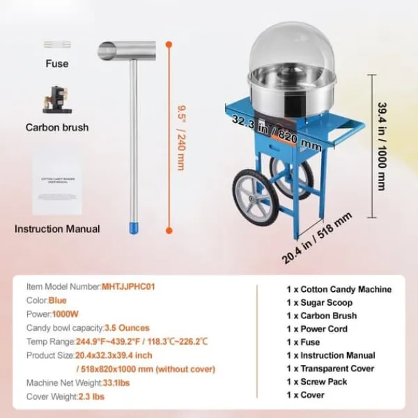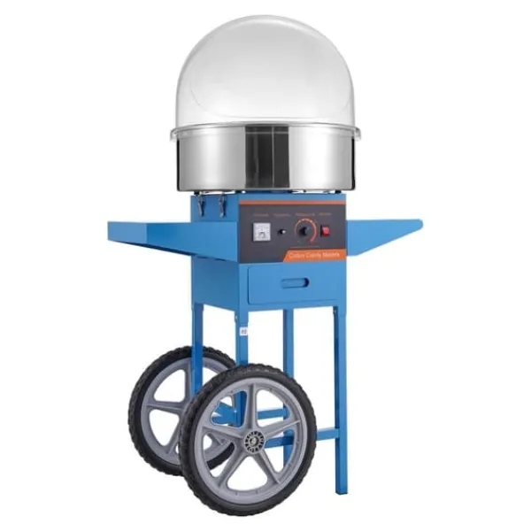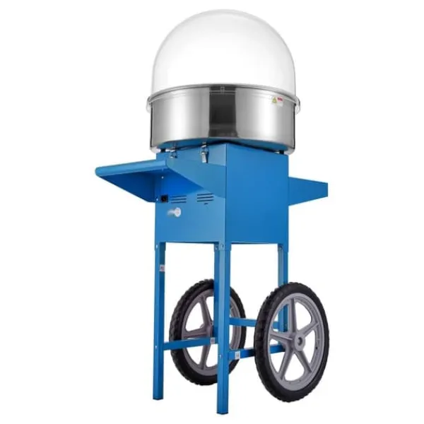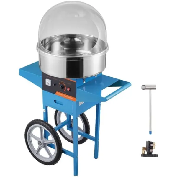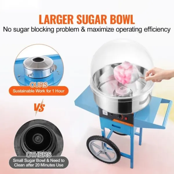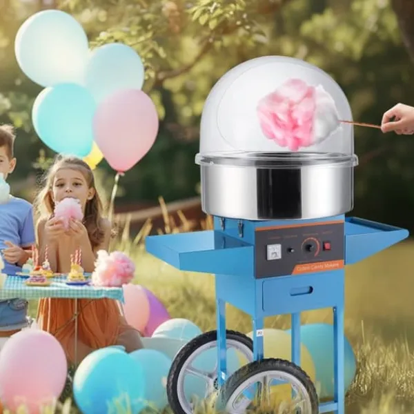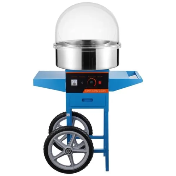 Denna sockervaddsmaskin kan användas med olika sorters godis, från traditionellt socker till hårda favoriter som frukttärningar. Dess smidiga hjul och robusta handtag gör den perfekt för evenemang som karnevaler, festivaler och födelsedagskalas.