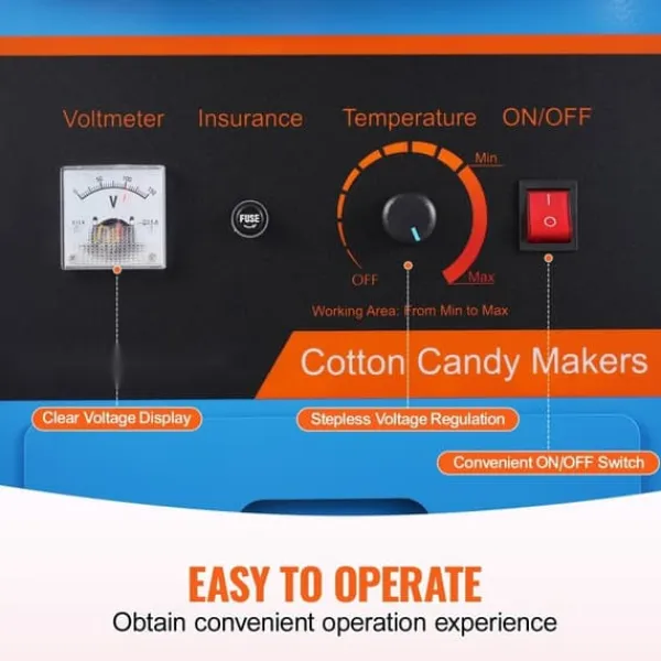 Den elektriska godistrådsmaskinen skiljer sig genom att ha en spänningsmätare och en ratt för temperaturkontroll. Genom att justera spänningen kan temperaturen enkelt regleras från 118,3℃ till 226,2℃. Detta gör det möjligt att experimentera med olika smaker och sorters socker.