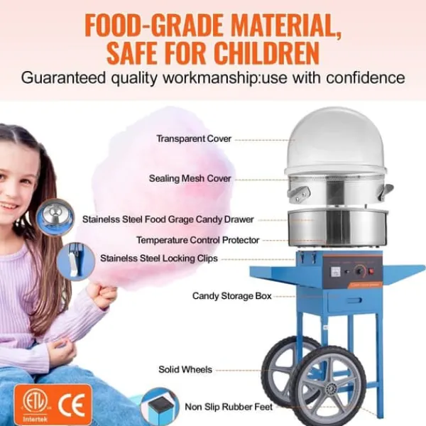 Maskinen har en praktisk godislåda för förvaring av sockervadd, skedar för enkel hantering av sockret, och tätningar som förhindrar sockerförluster. Det genomskinliga locket skyddar mot främmande föremål, och ETL/CE-certifieringen garanterar säker användning.