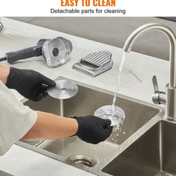 Avtagbar: De delar som kommer i kontakt med livsmedel är tillverkade av livsmedelsgodkänd 5Cr15MoV rostfritt stål, som är känt för sin slitstyrka och korrosionsbeständighet. För enkel rengöring är alla knivar och tillbehör avtagbara.