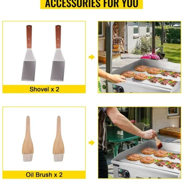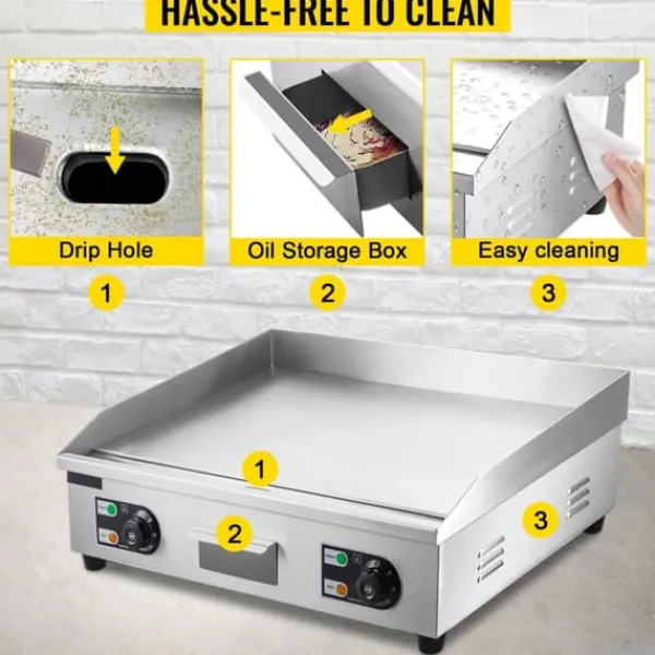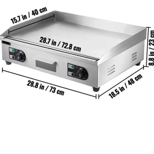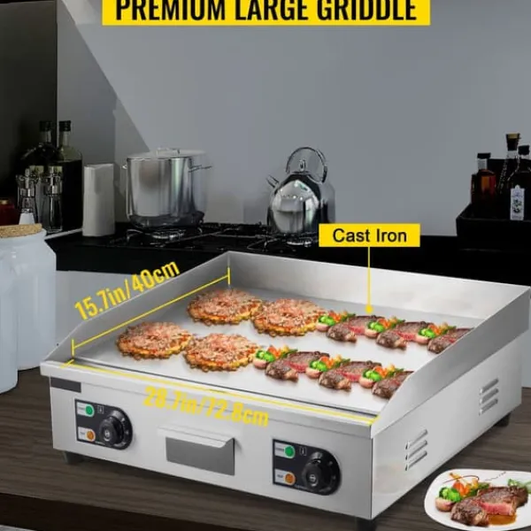 – Tillräcklig matlagningsyta: Denna kommersiella elektriska stekpanna har en kraftig kokplatta i gjutjärn med en stor kokyta och en tjocklek på 0,3 tum (8 mm). Den helt plana ytan värms jämnt för konsekventa tillagningsresultat, vilket gör den perfekt för en mängd olika livsmedel.
