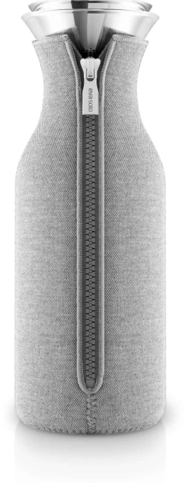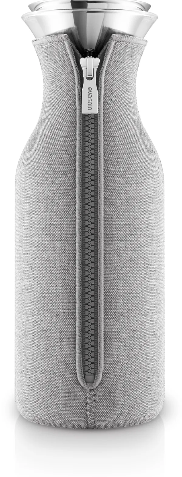 Karaffen från Eva Solo passar in i de flesta kylskåpsdörrar och är lämplig för både kalla och varma drycker. Den patenterade hällkanten i rostfritt stål och silikon säkerställer att karaffen är 100% droppfri, så att din favoritdryck hamnar i glaset och inte på bordsduken. Det medföljande lutande locket öppnas automatiskt när du häller, och locket ser till att innehållet i karaffen hålls varmt eller kallt längre och att inget kondensvatten hamnar på bordet. Skyddet är tillverkat av neopren med en utsida av vävt tyg med struktur. Både glas- och metalldelarna kan maskindiskas, och locket kan maskindiskas i 30°C.