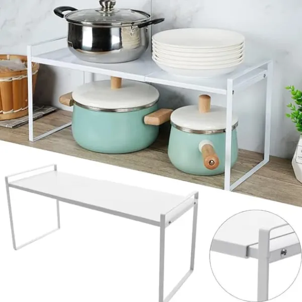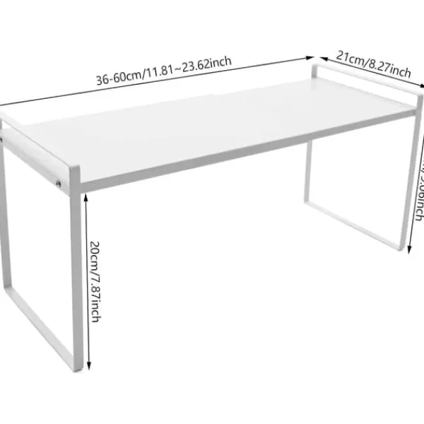 Denna vita, teleskopiska kökshylla ger dig extra nivåer i skåp och på bänkskivor. Med sin justerbara längd från 36 till 60 cm skapar den ordning för allt från kryddor till små köksredskap, samtidigt som utrymmet under hyllan kan nyttjas för tallrikar och skålar.