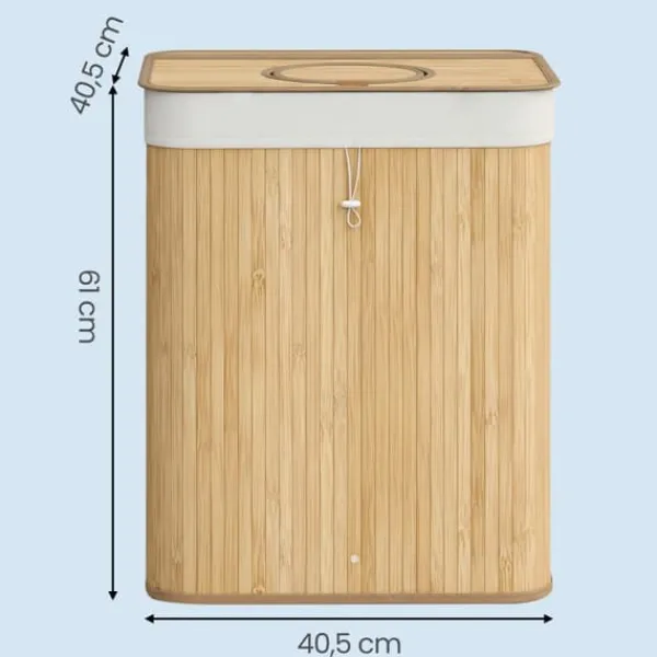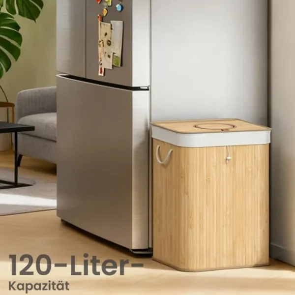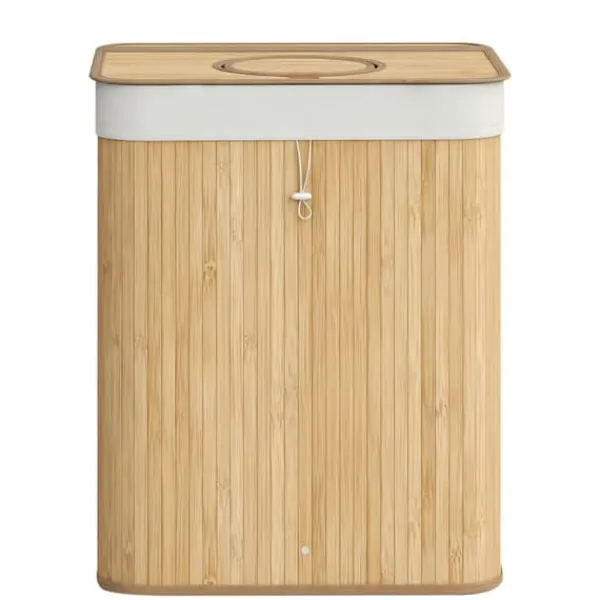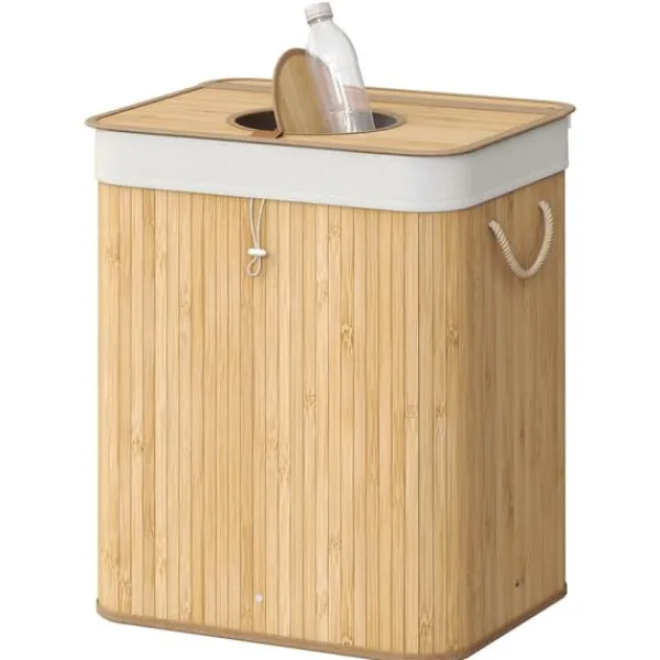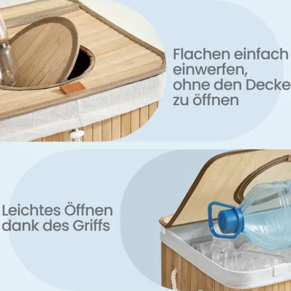Denna återvinningsbehållare i bambu är utformad för effektiv insamling och förvaring av pantflaskor i ditt kök eller grovkök. Den har ett praktiskt lock, innerpåse med handtag och en smidig öppning för enkel flaskhantering. Den naturliga beige färgen smälter in sömlöst med olika heminredningar.
