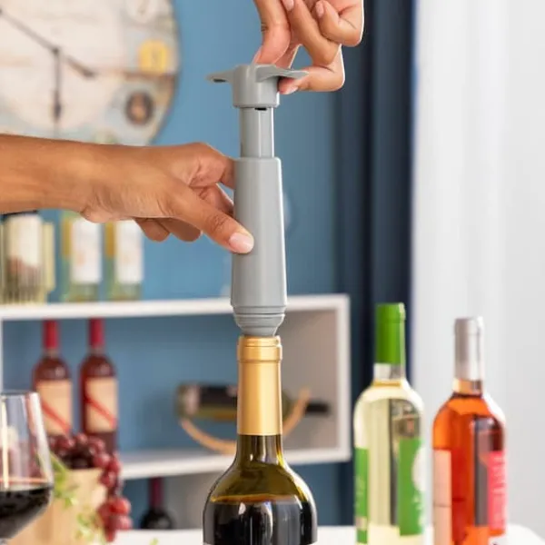 - Manuell vakuumpump: Denna vakuumpump för öppna vinflaskor hjälper till att hålla vinet i toppskick längre eftersom den pressar ut luften ur flaskan och skapar en tät vakuumförsegling. Ett enkelt sätt att förvara vin som blivit över i flaskan utan att det förlorar sina egenskaper.