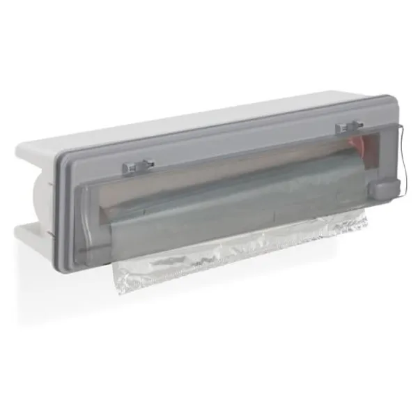 Denna praktiska folieskärare är det perfekta kökshjälpmedlet och är enkel att använda. Placera aluminiumfolie eller plastfolie i dispensern, dra ut önskad längd och skjut reglaget till andra sidan. Folien skärs rent och smidigt. Rullens bredd är justerbar. Folieskäraren kan monteras utan att borra: tack vare de fyra sugkopparna fäster den på alla släta ytor.