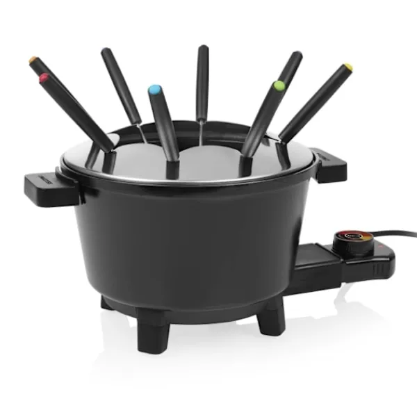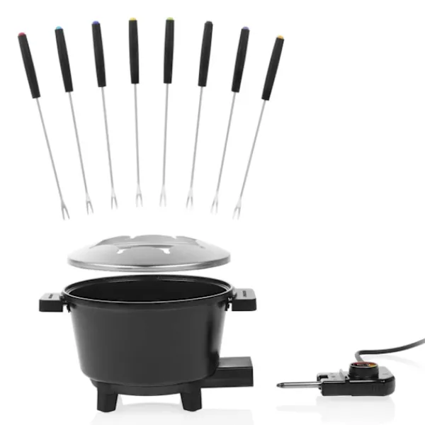 Stor volym 1,5L – Justerbar termostat Den stora 1,5L fondugrytan med 8 gafflar och justerbar termostat är perfekt för kött-, ost- eller chokladfondue. Med slitstark keramisk beläggning och svala handtag för maximal njutning.
