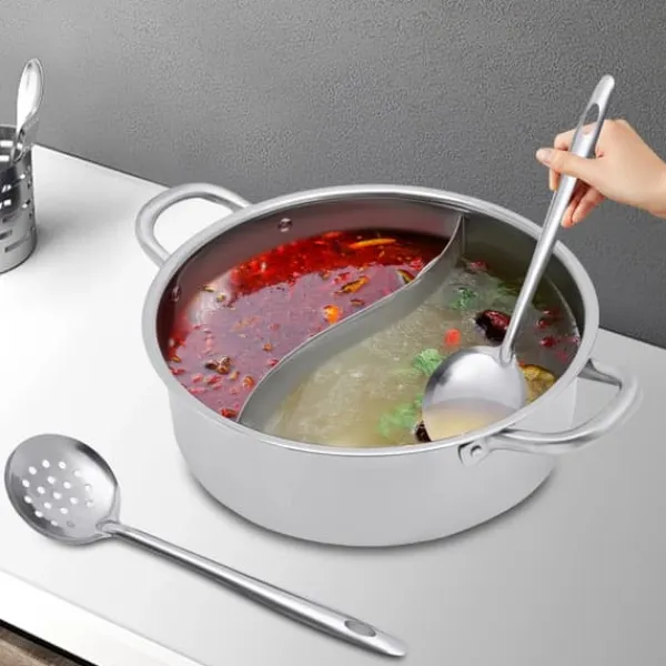 Delad rostfri hotpot 28 cm med glaslockEn modern, tvådelad hotpot i rostfritt stål som låter dig koka två smaker samtidigt – perfekt för familjemiddagar och mindre sällskap. Med 28 cm diameter, plan botten och klart glaslock får du jämn värme, smidig användning och full insyn.