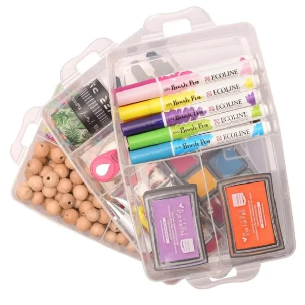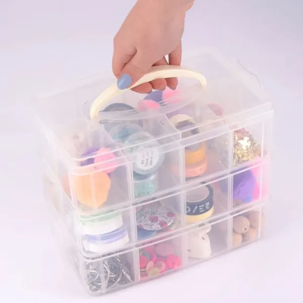 Förvaringslådan består av 3 lager som du enkelt klickar ihop. Förutom hobbytillbehör som smyckestillverkning, diamantmålning, mosaik, korttillverkning och scrapbooking, är sorteringssystemet också idealiskt för att förvara smink, skruvar och mindre byggklossar.