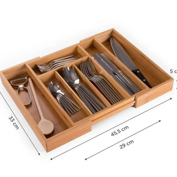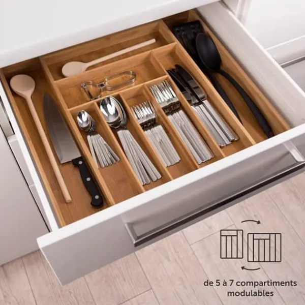 Organisatör för justerbar låda i högkvalitativ bambu, anpassar sig från 29 x 33 x 5 cm till 45,5 x 33 x 5 cm. Med 5 fack i normal konfiguration och 7 i utvidgad konfiguration, möjliggör den enkel förvaring av dina bestick och tillbehör. Perfekt för köket, kontoret eller badrummet.