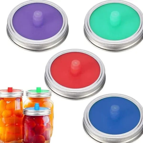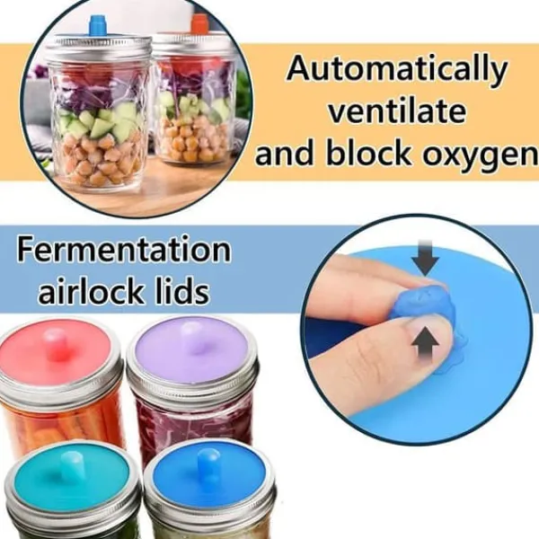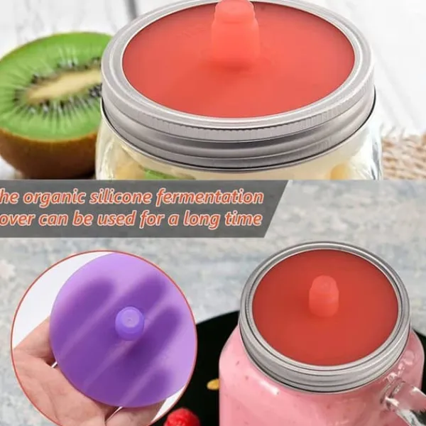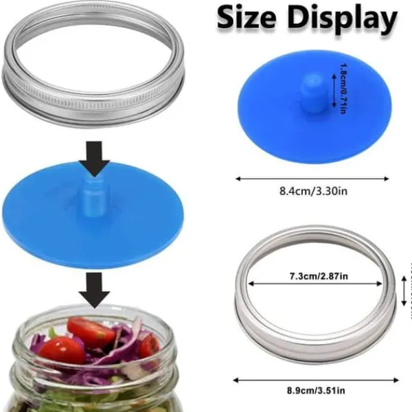 Set med 4 silikonburkar – Stort lock – Livsmedelsklass – Utan vatten – Fermenteringsaccessoarer – För surkål, kimchi, gurkor, fermenterade probiotiska livsmedel – 2TE8154 Livsmedelsklassmaterial: fermenteringslocken är tillverkade av livsmedelsklass silikon. De är BPA-fria och innehåller inga ftalater, icke-toxiska och miljövänliga, perfekta för lagring av en mängd olika livsmedel. Vattenfritt fermenteringslås: Täck behållaren med ett fermenteringslås för att minska risken för mögel utan underhåll. Toppen av locket har en ventil som automatiskt släpper ut gasen och stoppar syre från att komma in, så att inga explosioner av behållare eller böjda lock skapas, vilket innebär att du inte behöver trycka dagligen för att lättade övertryck och hålla vattennivån. Vidöppen förvaringsburk: fermenteringslock med en diameter på 84 mm, varje lock är perfekt för alla Mason-burkar med bred öppning. Du kan utrusta vilken Mason-burk som helst med bred öppning med ett lock i din favoritfärg. Lätt att rengöra: design med bred öppning gör fermenteringslocket lätt att öppna, lätt att rengöra och tvätta. De flexibla silikonlocken möjliggör snabb och effektiv rengöring både i diskmaskin och för hand. Bred användningsområde: DIY fermenteringskonserveringsverktyg för att göra ferment som innehåller alla grönsaker, från kål till morötter, till gurkor, tomater, vitlök, rädisor och mer. Få probiotika hemma och på gång. Typ av låsning: Silikonlock Material: AkrylTillverkare: