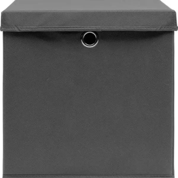 De praktiska förvaringslådorna är tillverkade i nonwoven tyg som gör dem hållbara. Varje låda har ett lock som håller innehållet rent. Varje förvaringslåda har dessutom en praktisk öljett i metall så att du kan dra ut dem från garderoben, hyllan eller skåpet. När de inte används kan förvaringslådorna vikas ihop för att spara utrymme.