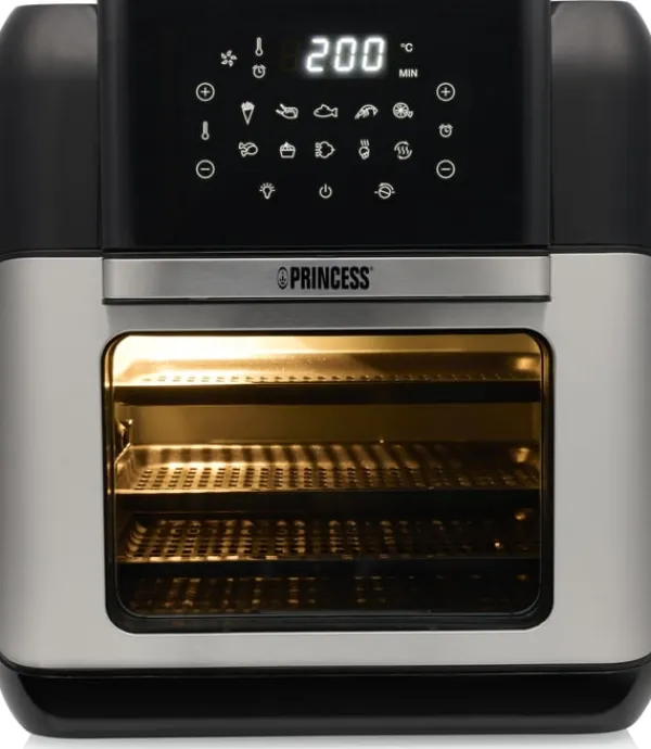 Princess Aerofryer-ugnen kombinerar varm cirkulerande luft vid perfekt temperatur, så du kan använda Aerofryer för stekning, bakning, grillning och rostning. Den snabba luftflödestekniken säkerställer att du inte behöver olja för att uppnå perfekta och krispiga resultat. Förutom de tio förinställda inställningarna kan du manuellt justera temperaturen mellan 80 – 200 °C för att uppnå perfekta resultat. Detta gör till exempel bakning av brödrullar och köttbullar enkelt. Med de medföljande tre ugnsplåtarna kan du anpassa många produkter samtidigt i ugnen.