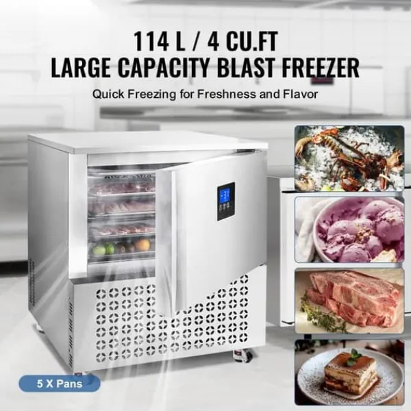 Denna blastfrysare är utrustad med en högpresterande kompressor som accelererar kall luftcirkulationen för snabb fryshastighet. Med en rymlig kapacitet på 114 L är den idealisk för professionella kök såsom skaldjursrestauranger, västerländska restauranger och centralkök.