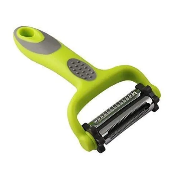 Rotativ Huvud och Multifunktionell Upplevelse: Med 3 vassa och skarpa tandade blad, ett julienneblad och ett rakblad för en multifunktionell upplevelse: Ett rakblad för att ta bort skal; ett julienneblad för att skapa vackra garnityrstrimlor; och ett tandat skalblad för mjukare skal. Det är enkelt och skonsamt att skala olika frukter och grönsaker på 3 sätt.