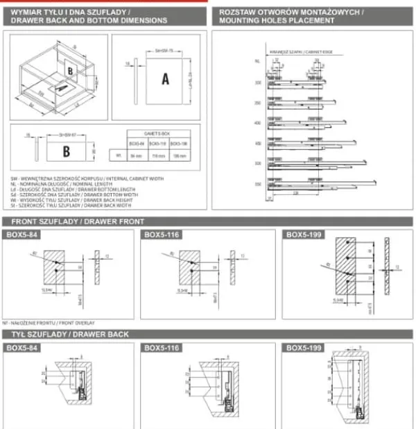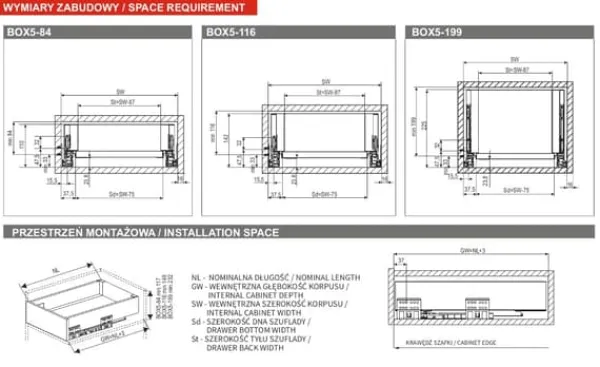 S-BOX är en tunnväggig låda tillverkad av högkvalitativa material, tack vare vilken den arbetar tyst och smidigt. Dess höga lastkapacitet (upp till 40 kg) möjliggör stressfri förvaring av alla typer av föremål. Lådan är mycket felfri, med 60 000 öppnings- och stängningscykler, vilket innebär att den kan användas utan fel i upp till 11 år. Lådan har full utdragbarhet och ljudlös stängning. Den finns i tre olika höjder och flera längder.