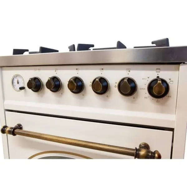 Idealisk för stilmedvetna matälskare och ambitiösa hemmakockar: denna fristående spis med en raffinerad gräddfärg och accenter av rostfritt stål ger varje kök en varm och nostalgisk ton.