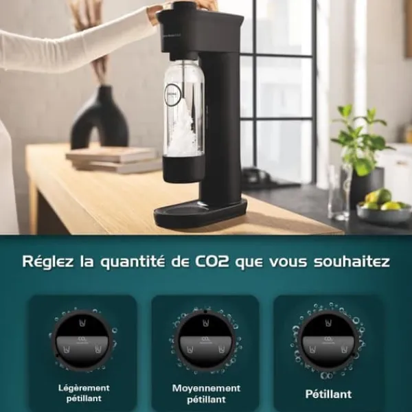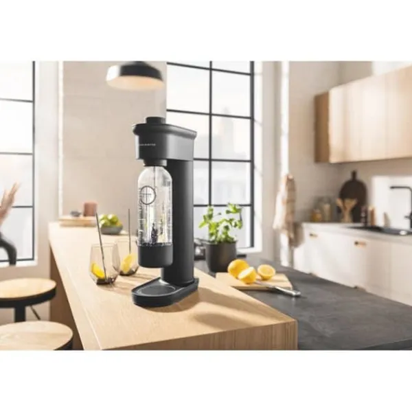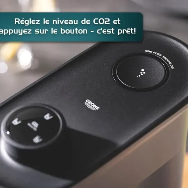 Förbättra din hydrering rutin: med vattenkolsyraren GROHE Blue Fizz kan du förvandla kranvattnet till kolsyrat vatten med ett enkelt tryck på en knapp. Med sin praktiska design och pålitliga funktion gör vår sodamaskin det möjligt att kolsyrera kranvattnet enligt varje persons önskemål. Du får kolsyrat vatten som är perfekt anpassat efter din smak, vilket hjälper dig att hålla dig fräsch och hydratiserad hela dagen. Dessutom kräver denna apparat ingen installation! Du kan njuta av kolsyrat vatten omedelbart efter att du har packat upp din sodamaskin hemma. Med GROHE Blue Fizz är kolsyrat vatten alltid inom räckhåll. Vattenkolsyraren GROHE Blue Fizz med CO2-nivåvisning gör att du kan hålla koll på karboneringsnivån i ditt vatten. Tack vare denna avancerade funktion kan du justera kolsyranivån utan tvekan, samtidigt som du exakt vet hur mycket CO2 som finns kvar i flaskan. Med den intuitiva förinställningen för CO2-nivåer kan du dricka kolsyrat vatten som passar dina preferenser. För att göra detta behöver du bara vrida på knappen för att välja mellan tre förinställda alternativ: lätt kolsyrat vatten, måttligt kolsyrat vatten eller kolsyrat vatten. Kolsyrning med ett enda tryck: vill du att ditt vatten ska vara precis lagom kolsyrat, som du gillar det? Justera då CO2-nivån du vill ha och tryck på knappen – det är så enkelt och du behöver inte göra några fler justeringar. Snabb fästning: GROHE Blue Fizz har också en flaskhållare med bajonettfäste, vilket säkerställer en enkel och säker anslutning av din vattenflaska. Denna praktiska funktion gör att du kan kolsyrera.