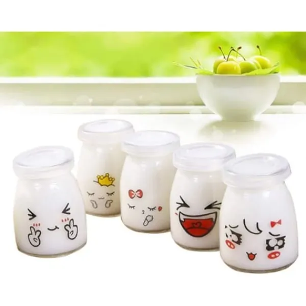 Dessa puddingflaskor har en kapacitet på 100 ml och är bakade i tecknade stilar. Flaskan är liten och utsökt, tillverkad av transparent glas, så att du kan se innehållet direkt. Flaskan är målad med en mängd olika livfulla och intressanta tecknade uttryck, som blyg, rolig, söt, etc., vilket gör flaskan full av livlig och lekfull atmosfär, vilket kan ge en roligare miljö. Den är lämplig för att förvara pudding, yoghurt och andra livsmedel. Den är både praktisk och dekorativ. Som produktförpackning kan den öka attraktiviteten.