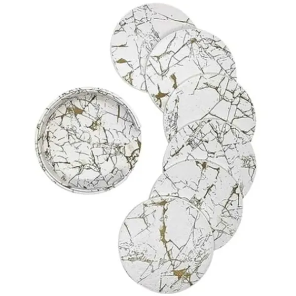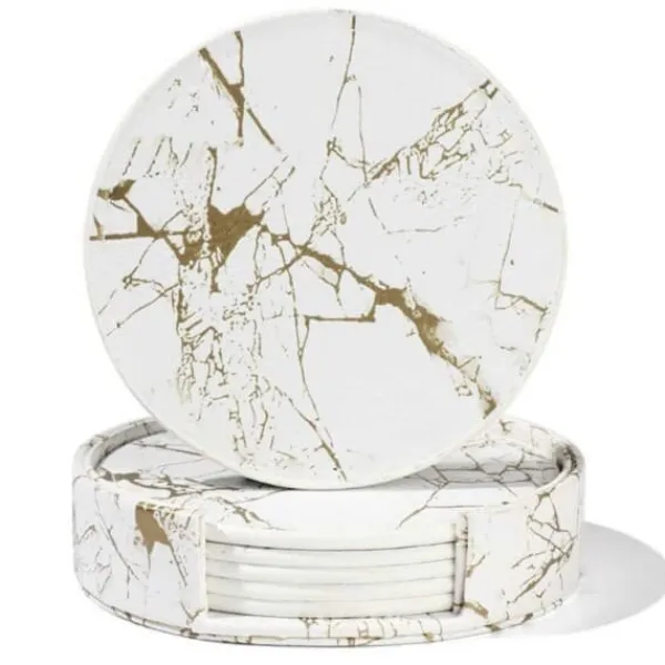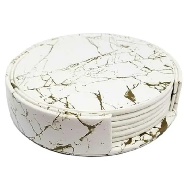 Förbättra din inredning med dessa eleganta 6-Pack glasunderlägg i PU-läder. Dessa underlägg är designade med en trendig kombination av guld, marmor och vit färg som kommer att ge en touch av lyx till ditt hem. Tillverkade av högkvalitativt PU-läder är dessa underlägg både hållbara och lätta att rengöra. De skyddar effektivt dina bord från fläckar och repor, samtidigt som de ger en modern och stilren känsla. Med detta 6-pack har du tillräckligt med underlägg för att placera dem runt om i ditt hem eller för att använda dem vid middagsbjudningar och fester.