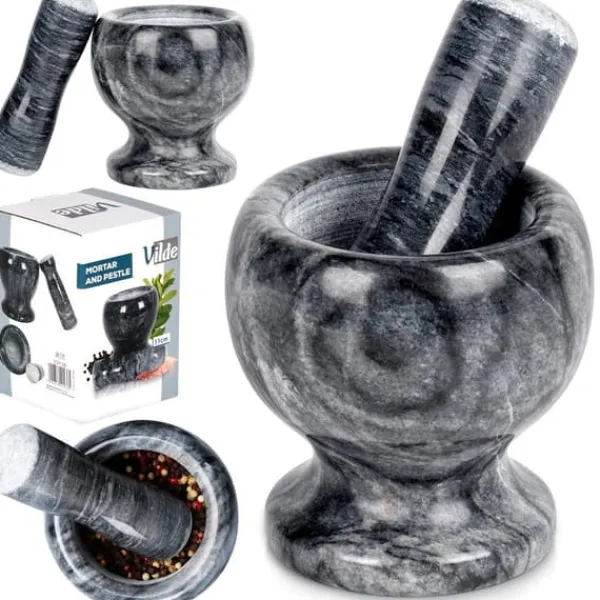 Mortel med mortelstöt tillverkad av material av högsta kvalitet. Extremt användbar i köket vid malning av kryddor, frön, örter och nötter. Tack vare sin solida konstruktion kommer den att vara ett oumbärligt verktyg i ditt kök. Morteln är tillverkad av naturlig granit; enskilda delar kan variera i struktur och färg. Original Vilde-produkt. Tillverkad i enlighet med europeiska standarder.