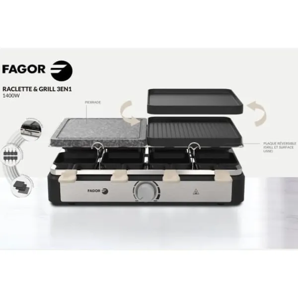 Bjud in dina vänner och familj på en utsökt måltid med FAGOR FGRG8 Raclette/GrilL! Denna raclettegrill är designad för 8 personer och har 1400 W effekt och en naturlig grillsten för autentisk grillning. Non-stick-beläggningen gör rengöringen enkel, medan den justerbara termostaten med indikatorlampa säkerställer perfekt kontroll över tillagningen. Med sina 8 non-stick-pannor och värmeelement i rostfritt stål är denna raclettegrill det perfekta verktyget för mysiga gourmetkvällar.