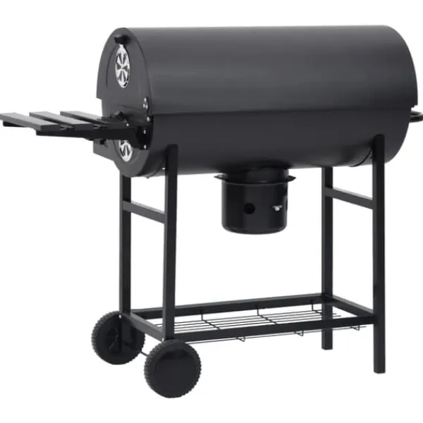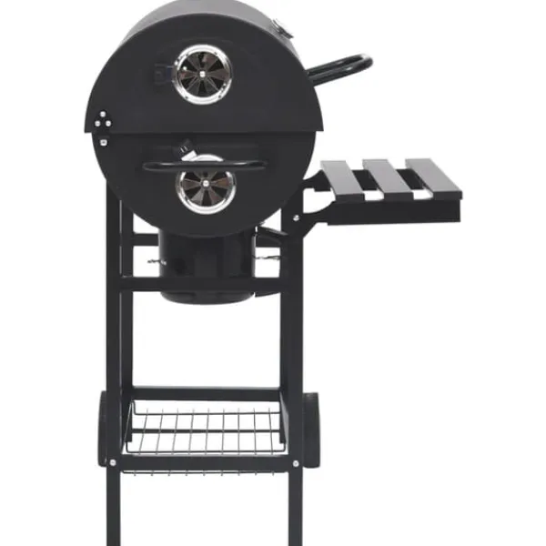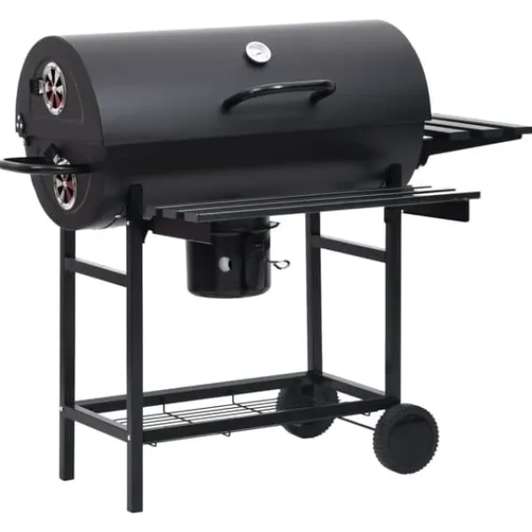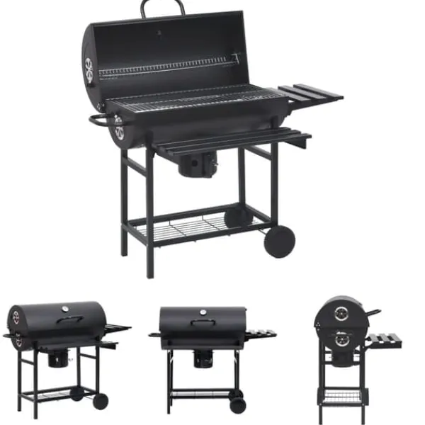 Grilltunnan är tillverkad av slitstarkt stål och är stark och hållbar. Locket med gångjärn har ett praktiskt handtag för att reglera temperaturen och hålla den termostatisk. Värmehyllan är användbar för att hålla maten varm så att du kan servera all mat samtidigt. Denna kolgrill har även ett nedfällbar sidobord och ett bord framtill för extra förvaring. Tack vare hjulen är det enkelt att flytta grillen. Den avtagbara askbehållaren gör rengöringen enkel.