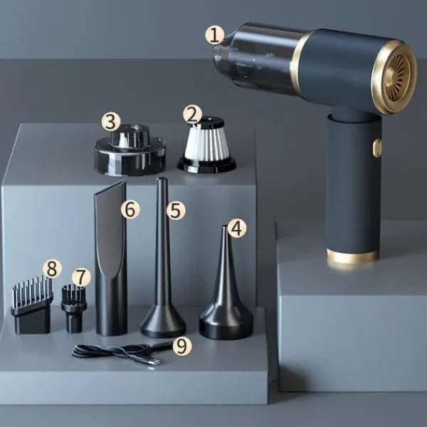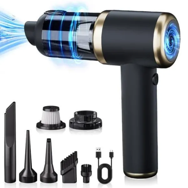 Mångsidig användning: Utrustad med flera tillbehör för både blåsfunktion och dammsugning. Perfekt för att rengöra svåråtkomliga områden som tangentbord, soffor, bilsäten och andra ytor.