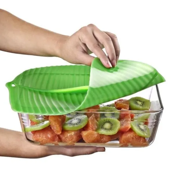 Tät förslutning i silikon i form av ett bananblad, perfekt för att bevara dina rätter. Multifunktionell, den tål temperaturer från -40°C till 230°C. Praktisk och estetisk, den ersätter plastfolie och är lätt att rengöra i diskmaskin. Ett oumbärligt tillbehör för en hälsosam och miljövänlig matlagning.