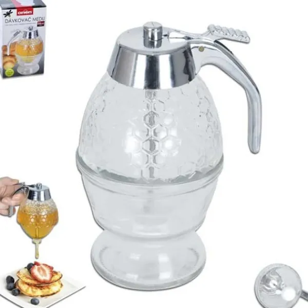 Honungsdispensern låter dig mäta en exakt portion för te, pannkakor etc. Den passar även till marinader och choklad. För att använda, tryck helt enkelt på spaken för att frigöra locket. Högkvalitativ honungsdispenser gjord av tjockt glas. Den består av en huvudbehållare och ett stativ. Dispenserar perfekt rätt mängd honung till te, godis och mer. Den passar även till sirap, t.ex. Tack vare sitt eleganta utseende kan den användas som en dekorativ del av bordet. Lätt att rengöra, bekväm att använda. Tillverkad av material som är hälsosäkra och matneutrala. Originalprodukt från det tjeckiska märket Orion.