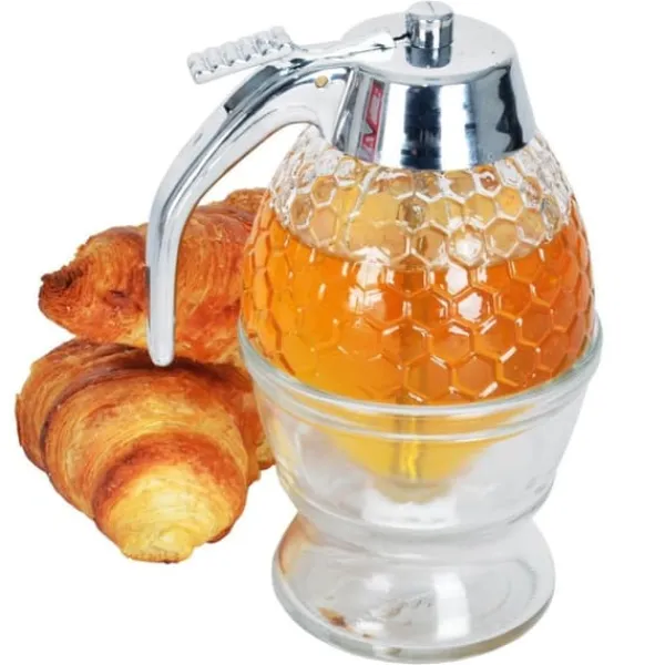 Honungsdispensern låter dig mäta en exakt portion för te, pannkakor etc. Den passar även till marinader och choklad. För att använda, tryck helt enkelt på spaken för att frigöra locket. Högkvalitativ honungsdispenser gjord av tjockt glas. Den består av en huvudbehållare och ett stativ. Dispenserar perfekt rätt mängd honung till te, godis och mer. Den passar även till sirap, t.ex. Tack vare sitt eleganta utseende kan den användas som en dekorativ del av bordet. Lätt att rengöra, bekväm att använda. Tillverkad av material som är hälsosäkra och matneutrala. Originalprodukt från det tjeckiska märket Orion.