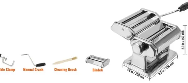 – Olika breddinställningar för olika smaker: Nudelvalsen och skäraren av rostfritt stål kan skära nudlar i två olika bredder: 0,06 tum eller 0,26 tum. Den är mycket lämplig för att göra tunna nudlar, pasta, etc., för att möta olika behov av pastatillverkning.