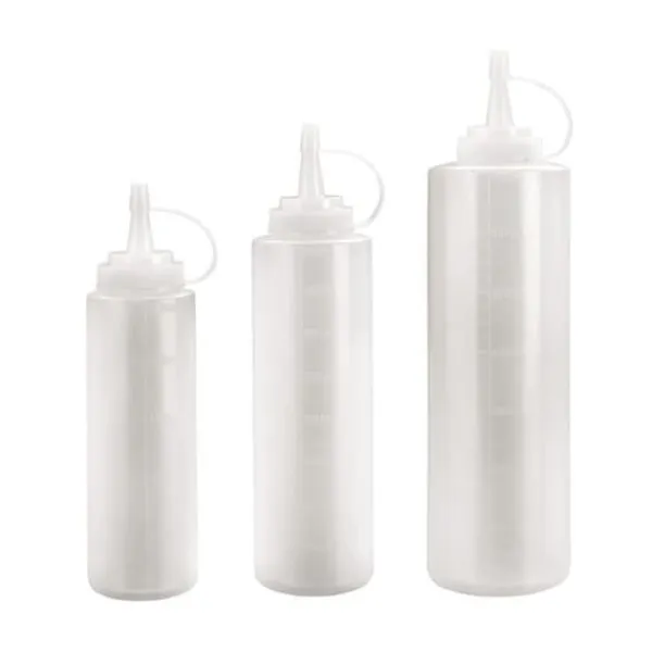 Flask doser i transparent, mjukt plast med graderad skala och kork. Idealisk för att dosera dina vätskor, den är diskmaskinsvänlig för enkel rengöring.