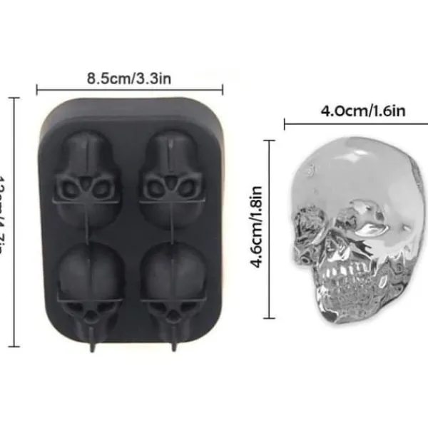 3D silikon isbitsform i form av en dödskalle, perfekt för cocktails och fester. Tillverkad av silikon och PP, den är LFGB-certifierad för livsmedelssäkerhet. Dess lock förhindrar lukter i kylskåpet. Lätt att rengöra och använda, perfekt för en mängd olika drycker.