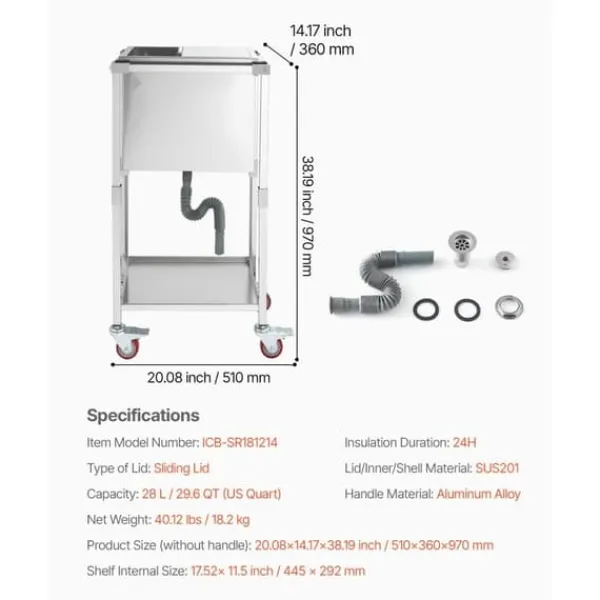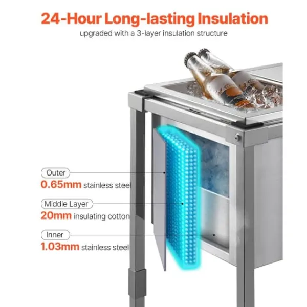 Iskylaren är tillverkad av NSF-certifierat rostfritt stål med en integrerad helsvetsningsprocess för att minska risken för läckage. Dess treskiktsisoleringsstruktur och avtagbara skjutbara lock ger över 24 timmars iskyla utan behov av elektricitet eller energi.
