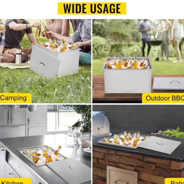 -Bekväm design: Denna drop-in kylare har en 2,2-tums diameter avlopp som suger bort smält is så att dina rester alltid finns till hands. Denna kylare i rostfritt stål har en avtappningsplugg med en diameter på 4,3 tum för enkel rengöring.