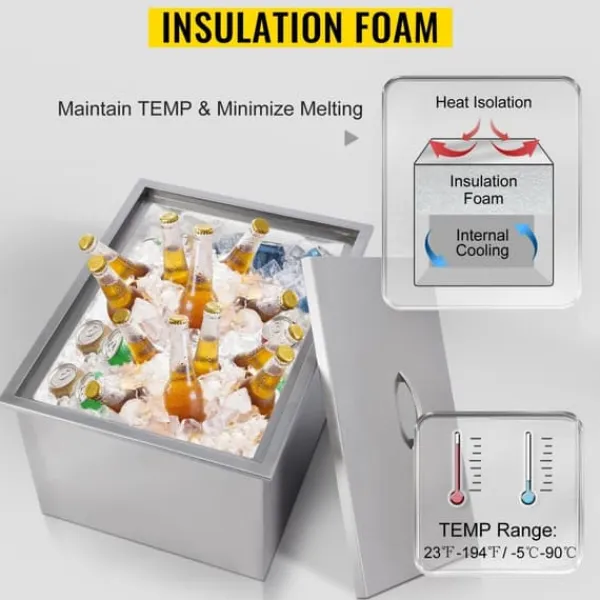– Robust konstruktion: Denna Drop-in islåda är gjord av borstat 304 rostfritt stålmaterial för långvarig hållbarhet. Och den är dubbelväggig design för bättre värmeisoleringsarbete. Interiören har skumgummiisolering med hög densitet som håller en inre temperatur mellan 23°F till 194°F, vilket säkerställer att dina isbitar håller sig svala längre.