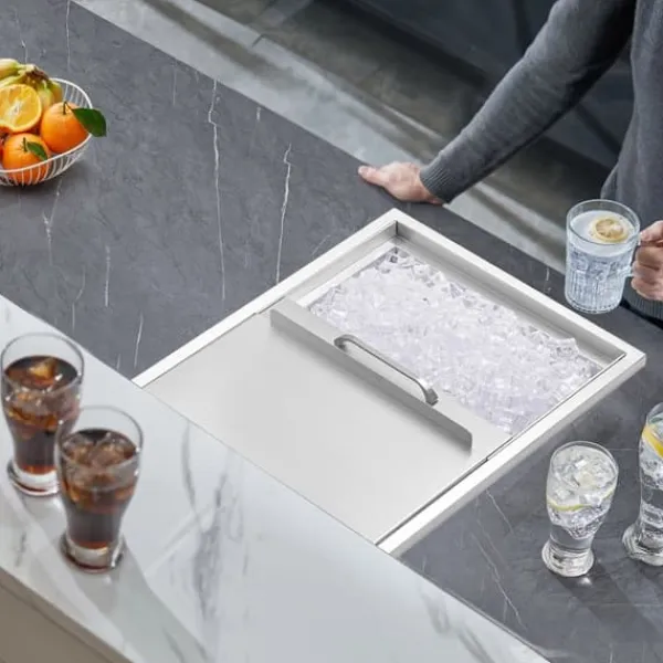 Perfekt för installation i dryckesbutiker, hotell, bardiskar och köksbänkar. Sparar utrymme och ger en praktisk lösning för isförvaring.