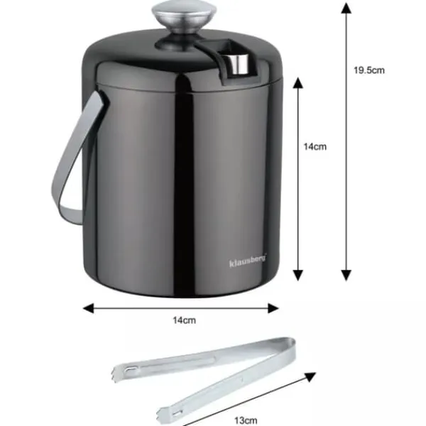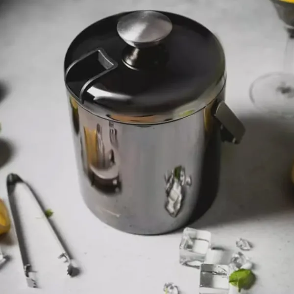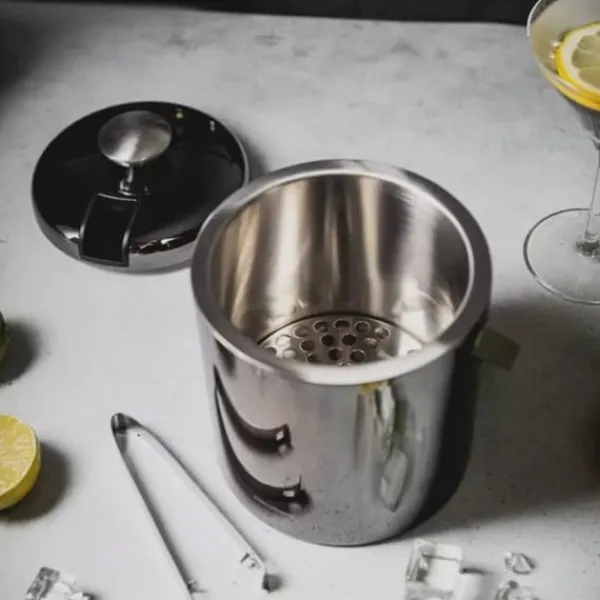 Den svarta ishinken är en elegant och funktionell del av alla bartenderset. Tillverkad av högkvalitativt rostfritt stål, garanterar hållbarhet och estetik under lång tid. Den svarta färgen ger den en unik karaktär och klass. Fina ljusreflektioner framhäver dess elegans, och praktiska istång kompletterar helheten. • Tillverkad av högkvalitativt rostfritt stål i svart, vilket säkerställer hållbarhet och korrosionsbeständighet. • Bekvämt, vridbart handtag för enkel transport och servering. • Dubbla termiska väggar som effektivt håller kylan, så att isen förblir kristallklar längre. • Utrustad med istång av exceptionell kvalitet gömd i locket, som möjliggör ett enkelt och säkert grepp om isbitar. • En praktisk sil för att separera is från vatten, vilket är extremt användbart vid tillagning av drycker. Alla som värdesätter elegans i kombination med funktionalitet kommer att uppskatta detta set i svart. Den är perfekt för både familjesammankomster och mer formella tillfällen. En ishink är ett måste för varje hemmabar. Mått: – Hinkdiameter: 14 cm – Ishinkhöjd: 14 cm (med lock: 19,5 cm) – Kapacitet 1,3L – Istångens längd: 13 cm