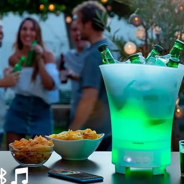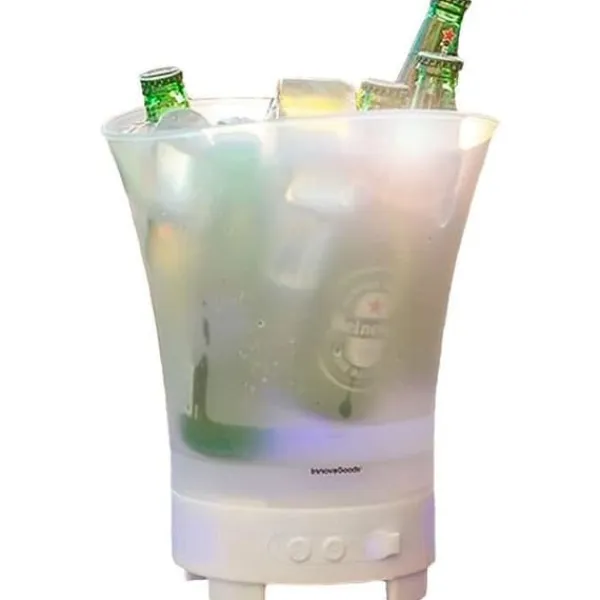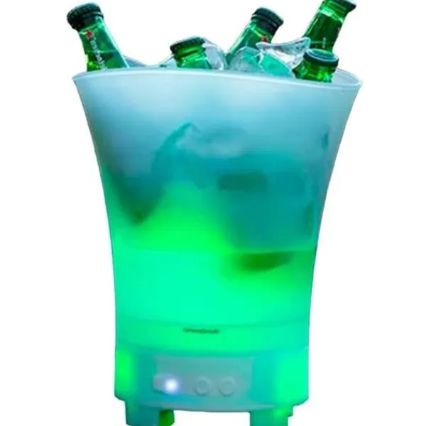 Mångsidig isbuckets i polypropen med LED-belysning och högtalare. 5 ljuslägen: fast, musik, snabb, långsam, blixt. Batteritid på 3-4 timmar. Mått: 24,5 x 29 x 23,5 cm. Inkluderar: USB till mikro USB-kabel.