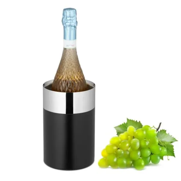 Elegant dubbelväggig dryckeskylare i rostfritt stål: Koppla av och njut av ett svalt glas vitt vin eller rosé med denna eleganta vinkylare. Den välisolerade vinkylen i rostfritt stål håller förkylda flaskor vid en låg temperatur under särskilt lång tid tack vare sin dubbelväggiga design. Flaskkylaren är också idealisk för att kyla mousserande vin, öl, champagne eller vattenflaskor. Med sin mattsvarta finish och glansiga kant är vitvinskylaren ett riktigt blickfång och perfekt för speciella tillfällen. Obs: Kyl flaskan i kylskåpet till önskad temperatur och placera den sedan i dryckeskylaren för att hålla den kallare längre. Själva flaskkylaren har ingen aktiv kylfunktion.