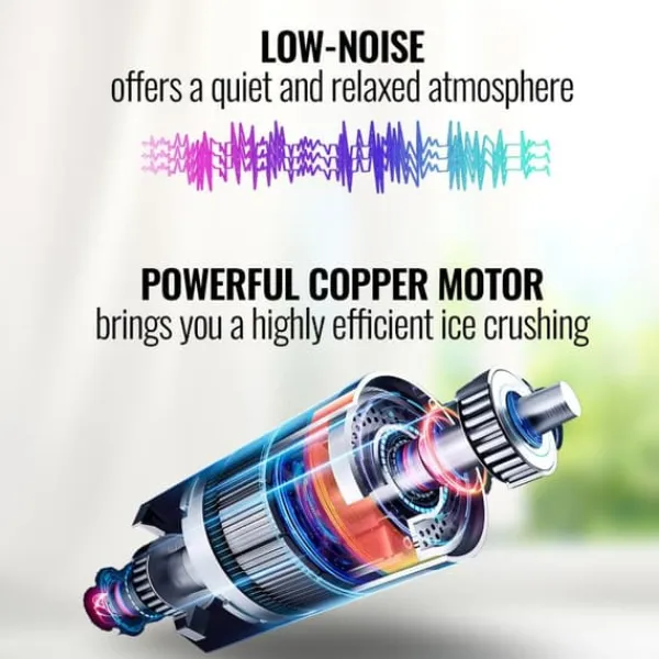 Vår elektriska dubbelbladiga iskross har en kraftfull 300W kopparmotor som snurrar med 1450 rpm, vilket ger dig hög uteffekt per timme och lågt ljud. Dess krosskapacitet kan tillgodose dina behov av rakad is på kort tid under maximalt passagerarflöde.