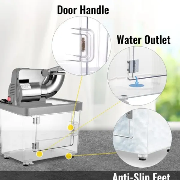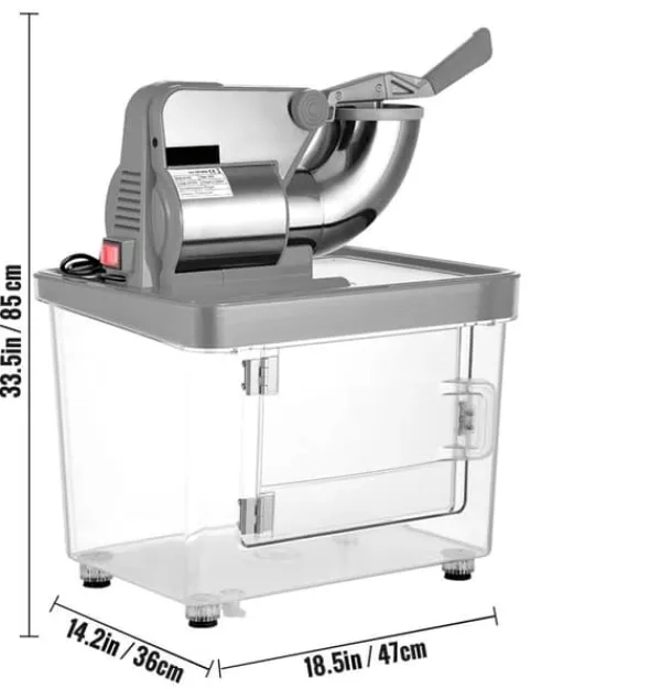 Dörrhandtaget gör det enkelt att öppna och ta bort den rakade isen. Vattenutloppet nedan används för att dränera smält is i tid. Anti-halkfötter kommer att hålla maskinen stabil under arbetet.