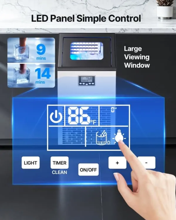 Smidig kontroll: Intuitiv LED-panel låter dig välja tjocka eller tunna isbitar med ett knapptryck. Det stora fönstret och blå innerbelysning gör att du kan följa processen utan att öppna locket.