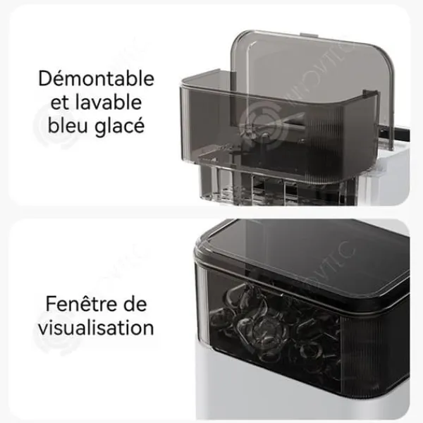 2. Tyst och lättanvänd: Denna bänkipmaskin är tyst (endast 35 decibel) och fungerar med en enda knapp. Med måtten 29 x 23 x 28 cm är den lätt att transportera och använda. Den använder en smart infraröd sensor för att upptäcka isnivå och låg vattennivå. En stor genomskinlig fönster gör det enkelt att övervaka isproduktionen.