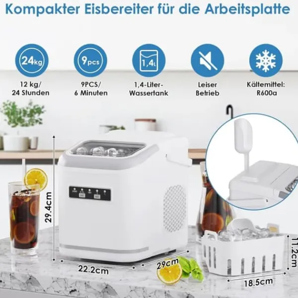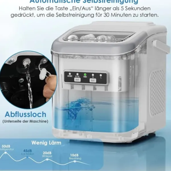 Kompakt ismaskin i silver för snabb och tyst iskraftDenna portabla ismaskin i silver gör upp till 12 kg is per dygn och producerar 9 isbitar på 6–8 minuter. Med tyst DC-fläkt, effektiv kompressor och vattenåtervinning passar den kök, kontor, camping och båt.