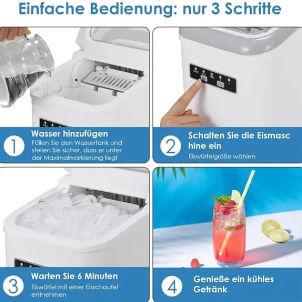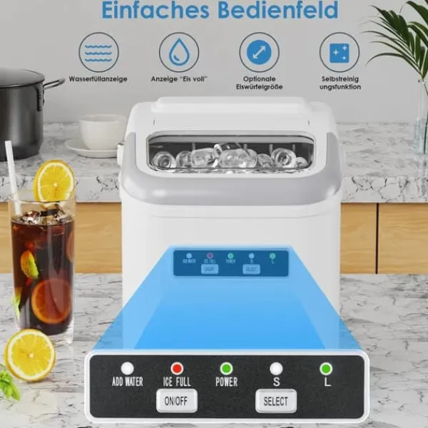 Enkel användningFyll på vatten, välj storlek med ”Select” och tryck ”ON/OFF”. Efter några minuter är isbitarna klara.