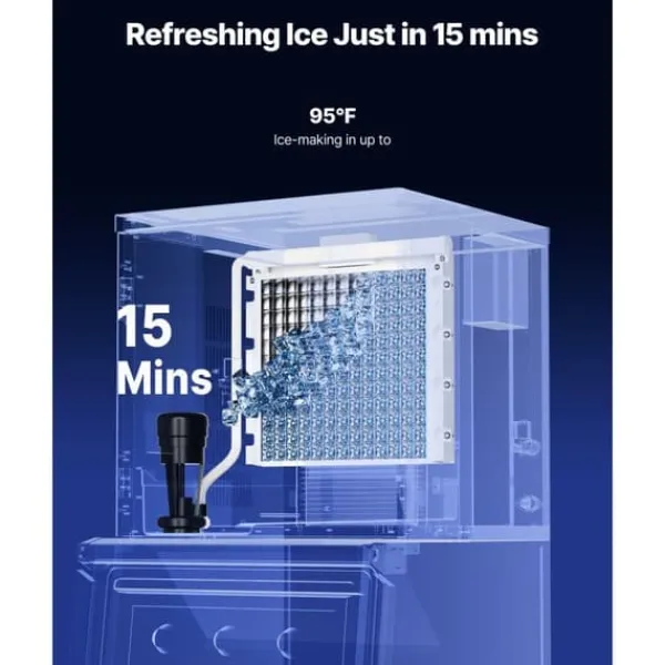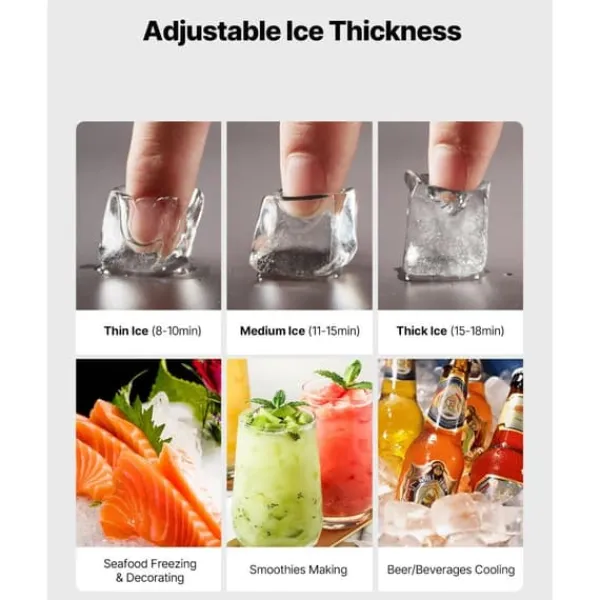 Snabb isproduktion: Den kommersiella ismaskinen är utrustad med 156 isbrickor, vilket möjliggör justering av tjockleken på isen genom att korta eller förlänga tillverkningstiden. Den kraftfulla kompressorn kan producera isbitar på endast 12-15 minuter.