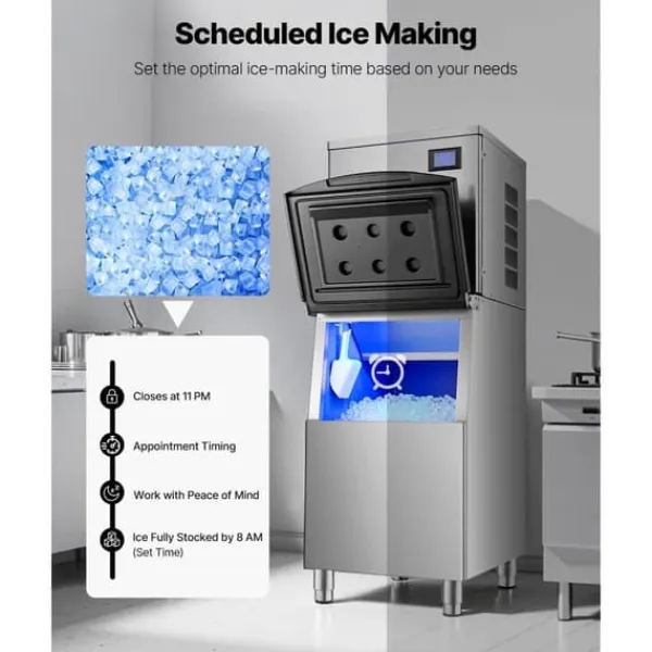 Stor isproduktion: Den kommersiella ismaskinen kan producera 550 lbs is per 24 timmar, vilket motsvarar ungefär 15 000 isbitar, och garanterar en kontinuerlig tillförsel av is i stora mängder.
